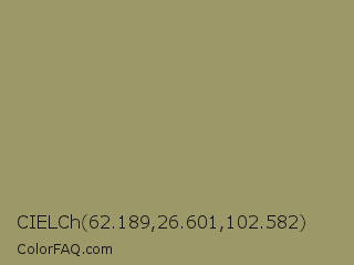 CIELCh 62.189,26.601,102.582 Color is a normal yellow color and the nearest color is Gurkha #9a9577. Hex code #9d9868 and RGB value is rgb(157,152,104). In RGB color space, this color is composed of 62% red, 60% green, 41% blue, In CMYK color space, this color is composed of 0% cyan, 3% magenta, 34% yellow , 38% black , In HSL color space, this color has a hue angle of 54° , 21% saturation and 51% lightness.