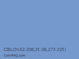 CIELCh 62.208,31.08,273.225 Color is a light blue color and the nearest color is Dark Pastel Blue #779ecb. Hex code #7598cd and RGB value is rgb(117,152,205). In RGB color space, this color is composed of 46% red, 60% green, 80% blue, In CMYK color space, this color is composed of 43% cyan, 26% magenta, 0% yellow , 20% black , In HSL color space, this color has a hue angle of 216° , 47% saturation and 63% lightness.