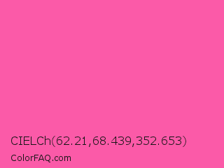CIELCh 62.21,68.439,352.653 Color is a light rose color and the nearest color is Brilliant Rose #ff55a3. Hex code #fb5aa8 and RGB value is rgb(251,90,168). In RGB color space, this color is composed of 98% red, 35% green, 66% blue, In CMYK color space, this color is composed of 0% cyan, 64% magenta, 33% yellow , 2% black , In HSL color space, this color has a hue angle of 331° , 95% saturation and 67% lightness.