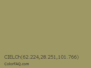 CIELCh 62.224,28.251,101.766 Color is a normal yellow color and the nearest color is Barley Corn #a68b5b. Hex code #9e9865 and RGB value is rgb(158,152,101). In RGB color space, this color is composed of 62% red, 60% green, 40% blue, In CMYK color space, this color is composed of 0% cyan, 4% magenta, 36% yellow , 38% black , In HSL color space, this color has a hue angle of 54° , 23% saturation and 51% lightness.