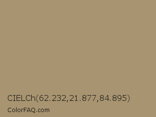 CIELCh 62.232,21.877,84.895 Color is a normal orange color and the nearest color is Sandal #aa8d6f. Hex code #a89470 and RGB value is rgb(168,148,112). In RGB color space, this color is composed of 66% red, 58% green, 44% blue, In CMYK color space, this color is composed of 0% cyan, 12% magenta, 33% yellow , 34% black , In HSL color space, this color has a hue angle of 39° , 24% saturation and 55% lightness.