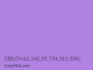 CIELCh 62.242,55.734,310.556 Color is a light violet color and the nearest color is Lavender #b57edc. Hex code #b082e2 and RGB value is rgb(176,130,226). In RGB color space, this color is composed of 69% red, 51% green, 89% blue, In CMYK color space, this color is composed of 22% cyan, 42% magenta, 0% yellow , 11% black , In HSL color space, this color has a hue angle of 269° , 62% saturation and 70% lightness.