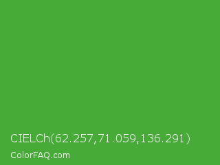 CIELCh 62.257,71.059,136.291 Color is a normal green color and the nearest color is Apple #4fa83d. Hex code #46ab37 and RGB value is rgb(70,171,55). In RGB color space, this color is composed of 27% red, 67% green, 22% blue, In CMYK color space, this color is composed of 59% cyan, 0% magenta, 68% yellow , 33% black , In HSL color space, this color has a hue angle of 112° , 51% saturation and 44% lightness.