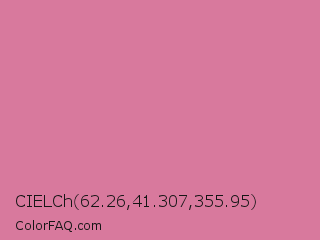 CIELCh 62.26,41.307,355.95 Color is a light rose color and the nearest color is Charm #d47494. Hex code #d8799d and RGB value is rgb(216,121,157). In RGB color space, this color is composed of 85% red, 47% green, 62% blue, In CMYK color space, this color is composed of 0% cyan, 44% magenta, 27% yellow , 15% black , In HSL color space, this color has a hue angle of 337° , 55% saturation and 66% lightness.