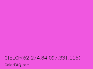 CIELCh 62.274,84.097,331.115 Color is a light magenta color and the nearest color is Purple Pizzazz #fe4eda. Hex code #f057e0 and RGB value is rgb(240,87,224). In RGB color space, this color is composed of 94% red, 34% green, 88% blue, In CMYK color space, this color is composed of 0% cyan, 64% magenta, 7% yellow , 6% black , In HSL color space, this color has a hue angle of 306° , 84% saturation and 64% lightness.