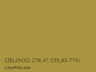 CIELCh 62.278,47.035,93.779 Color is a normal yellow color and the nearest color is Brass #b5a642. Hex code #aa9640 and RGB value is rgb(170,150,64). In RGB color space, this color is composed of 67% red, 59% green, 25% blue, In CMYK color space, this color is composed of 0% cyan, 12% magenta, 62% yellow , 33% black , In HSL color space, this color has a hue angle of 49° , 45% saturation and 46% lightness.