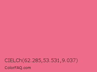 CIELCh 62.285,53.531,9.037 Color is a light red color and the nearest color is Light Crimson #f56991. Hex code #ee6c8a and RGB value is rgb(238,108,138). In RGB color space, this color is composed of 93% red, 42% green, 54% blue, In CMYK color space, this color is composed of 0% cyan, 55% magenta, 42% yellow , 7% black , In HSL color space, this color has a hue angle of 346° , 79% saturation and 68% lightness.