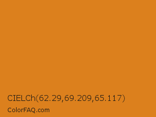 CIELCh 62.29,69.209,65.117 Color is a normal orange color and the nearest color is Zest #e5841b. Hex code #dc801d and RGB value is rgb(220,128,29). In RGB color space, this color is composed of 86% red, 50% green, 11% blue, In CMYK color space, this color is composed of 0% cyan, 42% magenta, 87% yellow , 14% black , In HSL color space, this color has a hue angle of 31° , 77% saturation and 49% lightness.