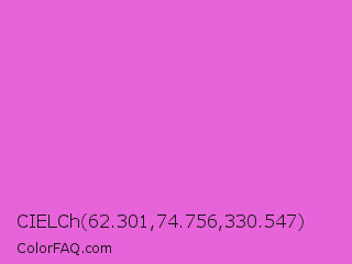 CIELCh 62.301,74.756,330.547 Color is a light magenta color and the nearest color is Orchid #da70d6. Hex code #e663d9 and RGB value is rgb(230,99,217). In RGB color space, this color is composed of 90% red, 39% green, 85% blue, In CMYK color space, this color is composed of 0% cyan, 57% magenta, 6% yellow , 10% black , In HSL color space, this color has a hue angle of 306° , 72% saturation and 65% lightness.