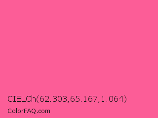 CIELCh 62.303,65.167,1.064 Color is a light rose color and the nearest color is Strawberry #fc5a8d. Hex code #fc5d97 and RGB value is rgb(252,93,151). In RGB color space, this color is composed of 99% red, 36% green, 59% blue, In CMYK color space, this color is composed of 0% cyan, 63% magenta, 40% yellow , 1% black , In HSL color space, this color has a hue angle of 338° , 96% saturation and 68% lightness.