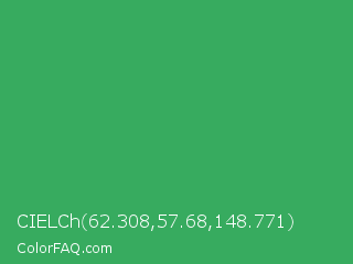 CIELCh 62.308,57.68,148.771 Color is a normal green color and the nearest color is Chateau Green #40a860. Hex code #37ab5f and RGB value is rgb(55,171,95). In RGB color space, this color is composed of 22% red, 67% green, 37% blue, In CMYK color space, this color is composed of 68% cyan, 0% magenta, 44% yellow , 33% black , In HSL color space, this color has a hue angle of 141° , 51% saturation and 44% lightness.