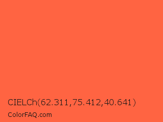 CIELCh 62.311,75.412,40.641 Color is a light red color and the nearest color is Tomato #ff6347. Hex code #ff6442 and RGB value is rgb(255,100,66). In RGB color space, this color is composed of 100% red, 39% green, 26% blue, In CMYK color space, this color is composed of 0% cyan, 61% magenta, 74% yellow , 0% black , In HSL color space, this color has a hue angle of 11° , 100% saturation and 63% lightness.