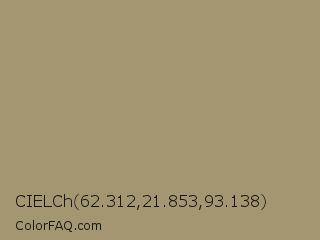 CIELCh 62.312,21.853,93.138 Color is a normal orange color and the nearest color is Donkey Brown #a69279. Hex code #a39670 and RGB value is rgb(163,150,112). In RGB color space, this color is composed of 64% red, 59% green, 44% blue, In CMYK color space, this color is composed of 0% cyan, 8% magenta, 31% yellow , 36% black , In HSL color space, this color has a hue angle of 45° , 22% saturation and 54% lightness.
