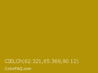 CIELCh 62.321,65.369,90.12 Color is a normal yellow color and the nearest color is Dark Goldenrod #b8860b. Hex code #b39407 and RGB value is rgb(179,148,7). In RGB color space, this color is composed of 70% red, 58% green, 3% blue, In CMYK color space, this color is composed of 0% cyan, 17% magenta, 96% yellow , 30% black , In HSL color space, this color has a hue angle of 49° , 92% saturation and 36% lightness.