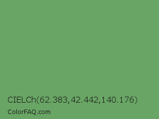 CIELCh 62.383,42.442,140.176 Color is a normal green color and the nearest color is Russian Green #679267. Hex code #69a565 and RGB value is rgb(105,165,101). In RGB color space, this color is composed of 41% red, 65% green, 40% blue, In CMYK color space, this color is composed of 36% cyan, 0% magenta, 39% yellow , 35% black , In HSL color space, this color has a hue angle of 116° , 26% saturation and 52% lightness.