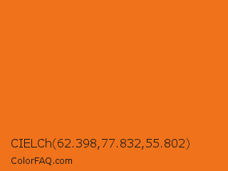 CIELCh 62.398,77.832,55.802 Color is a normal orange color and the nearest color is Tango #ed7a1c. Hex code #f0731c and RGB value is rgb(240,115,28). In RGB color space, this color is composed of 94% red, 45% green, 11% blue, In CMYK color space, this color is composed of 0% cyan, 52% magenta, 88% yellow , 6% black , In HSL color space, this color has a hue angle of 25° , 88% saturation and 53% lightness.