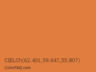 CIELCh 62.401,59.647,55.807 Color is a normal orange color and the nearest color is Raw Sienna Crayola #d27d46. Hex code #e07d3f and RGB value is rgb(224,125,63). In RGB color space, this color is composed of 88% red, 49% green, 25% blue, In CMYK color space, this color is composed of 0% cyan, 44% magenta, 72% yellow , 12% black , In HSL color space, this color has a hue angle of 23° , 72% saturation and 56% lightness.