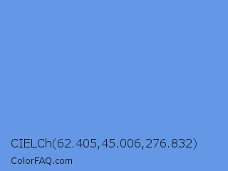 CIELCh 62.405,45.006,276.832 Color is a light blue color and the nearest color is Cornflower Blue #6495ed. Hex code #6498e6 and RGB value is rgb(100,152,230). In RGB color space, this color is composed of 39% red, 60% green, 90% blue, In CMYK color space, this color is composed of 57% cyan, 34% magenta, 0% yellow , 10% black , In HSL color space, this color has a hue angle of 216° , 72% saturation and 65% lightness.