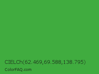 CIELCh 62.469,69.588,138.795 Color is a normal green color and the nearest color is Apple #4fa83d. Hex code #40ac3f and RGB value is rgb(64,172,63). In RGB color space, this color is composed of 25% red, 67% green, 25% blue, In CMYK color space, this color is composed of 63% cyan, 0% magenta, 63% yellow , 33% black , In HSL color space, this color has a hue angle of 119° , 46% saturation and 46% lightness.