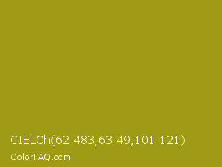 CIELCh 62.483,63.49,101.121 Color is a normal yellow color and the nearest color is Lucky #af9f1c. Hex code #a09b15 and RGB value is rgb(160,155,21). In RGB color space, this color is composed of 63% red, 61% green, 8% blue, In CMYK color space, this color is composed of 0% cyan, 3% magenta, 87% yellow , 37% black , In HSL color space, this color has a hue angle of 58° , 77% saturation and 35% lightness.