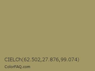CIELCh 62.502,27.876,99.074 Color is a normal yellow color and the nearest color is Sandal #aa8d6f. Hex code #a19866 and RGB value is rgb(161,152,102). In RGB color space, this color is composed of 63% red, 60% green, 40% blue, In CMYK color space, this color is composed of 0% cyan, 6% magenta, 37% yellow , 37% black , In HSL color space, this color has a hue angle of 51° , 24% saturation and 52% lightness.