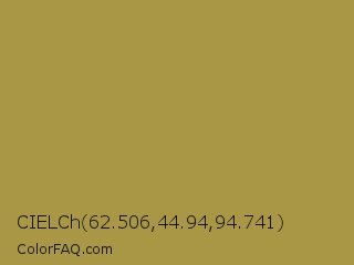 CIELCh 62.506,44.94,94.741 Color is a normal yellow color and the nearest color is Brass #b5a642. Hex code #a99745 and RGB value is rgb(169,151,69). In RGB color space, this color is composed of 66% red, 59% green, 27% blue, In CMYK color space, this color is composed of 0% cyan, 11% magenta, 59% yellow , 34% black , In HSL color space, this color has a hue angle of 49° , 42% saturation and 47% lightness.