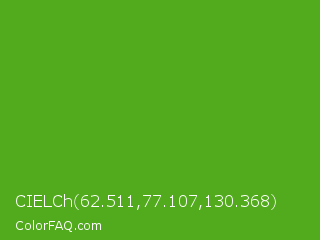 CIELCh 62.511,77.107,130.368 Color is a normal green color and the nearest color is Kelly Green #4cbb17. Hex code #52ab1c and RGB value is rgb(82,171,28). In RGB color space, this color is composed of 32% red, 67% green, 11% blue, In CMYK color space, this color is composed of 52% cyan, 0% magenta, 84% yellow , 33% black , In HSL color space, this color has a hue angle of 97° , 72% saturation and 39% lightness.