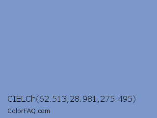 CIELCh 62.513,28.981,275.495 Color is a light blue color and the nearest color is Dark Pastel Blue #779ecb. Hex code #7c98ca and RGB value is rgb(124,152,202). In RGB color space, this color is composed of 49% red, 60% green, 79% blue, In CMYK color space, this color is composed of 39% cyan, 25% magenta, 0% yellow , 21% black , In HSL color space, this color has a hue angle of 218° , 42% saturation and 64% lightness.