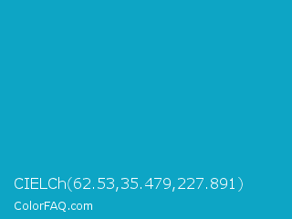 CIELCh 62.53,35.479,227.891 Color is a normal cyan color and the nearest color is Pacific Blue Crayola #009dc4. Hex code #0da5c5 and RGB value is rgb(13,165,197). In RGB color space, this color is composed of 5% red, 65% green, 77% blue, In CMYK color space, this color is composed of 93% cyan, 16% magenta, 0% yellow , 23% black , In HSL color space, this color has a hue angle of 190° , 88% saturation and 41% lightness.