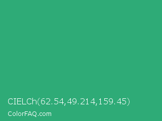 CIELCh 62.54,49.214,159.45 Color is a normal green color and the nearest color is Jungle Green #29ab87. Hex code #2eab77 and RGB value is rgb(46,171,119). In RGB color space, this color is composed of 18% red, 67% green, 47% blue, In CMYK color space, this color is composed of 73% cyan, 0% magenta, 30% yellow , 33% black , In HSL color space, this color has a hue angle of 155° , 58% saturation and 43% lightness.