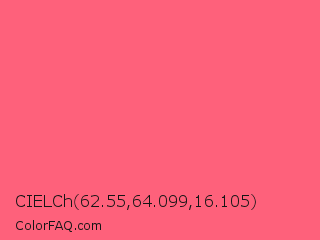 CIELCh 62.55,64.099,16.105 Color is a light red color and the nearest color is Brink Pink #fb607f. Hex code #fe617b and RGB value is rgb(254,97,123). In RGB color space, this color is composed of 100% red, 38% green, 48% blue, In CMYK color space, this color is composed of 0% cyan, 62% magenta, 52% yellow , 0% black , In HSL color space, this color has a hue angle of 350° , 99% saturation and 69% lightness.