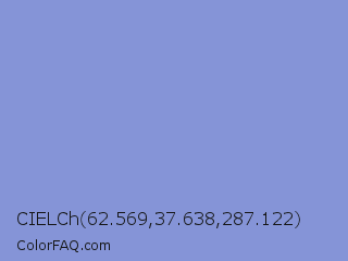 CIELCh 62.569,37.638,287.122 Color is a light blue color and the nearest color is Vista Blue #7c9ed9. Hex code #8594d7 and RGB value is rgb(133,148,215). In RGB color space, this color is composed of 52% red, 58% green, 84% blue, In CMYK color space, this color is composed of 38% cyan, 31% magenta, 0% yellow , 16% black , In HSL color space, this color has a hue angle of 229° , 51% saturation and 68% lightness.