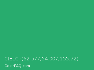 CIELCh 62.577,54.007,155.72 Color is a normal green color and the nearest color is Green Crayola #1cac78. Hex code #28ac6e and RGB value is rgb(40,172,110). In RGB color space, this color is composed of 16% red, 67% green, 43% blue, In CMYK color space, this color is composed of 77% cyan, 0% magenta, 36% yellow , 33% black , In HSL color space, this color has a hue angle of 152° , 62% saturation and 42% lightness.