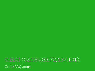 CIELCh 62.586,83.72,137.101 Color is a normal green color and the nearest color is Wageningen Green #34b233. Hex code #21af21 and RGB value is rgb(33,175,33). In RGB color space, this color is composed of 13% red, 69% green, 13% blue, In CMYK color space, this color is composed of 81% cyan, 0% magenta, 81% yellow , 31% black , In HSL color space, this color has a hue angle of 120° , 68% saturation and 41% lightness.