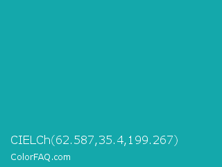 CIELCh 62.587,35.4,199.267 Color is a normal cyan color and the nearest color is Light Sea Green #20b2aa. Hex code #14a8ab and RGB value is rgb(20,168,171). In RGB color space, this color is composed of 8% red, 66% green, 67% blue, In CMYK color space, this color is composed of 88% cyan, 2% magenta, 0% yellow , 33% black , In HSL color space, this color has a hue angle of 181° , 79% saturation and 37% lightness.