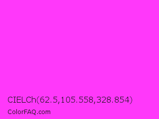 CIELCh 62.5,105.558,328.854 Color is a light magenta color and the nearest color is Purple Pizzazz #fe4eda. Hex code #ff38fa and RGB value is rgb(255,56,250). In RGB color space, this color is composed of 100% red, 22% green, 98% blue, In CMYK color space, this color is composed of 0% cyan, 78% magenta, 2% yellow , 0% black , In HSL color space, this color has a hue angle of 302° , 100% saturation and 61% lightness.
