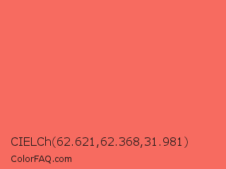 CIELCh 62.621,62.368,31.981 Color is a light red color and the nearest color is Bittersweet #fe6f5e. Hex code #f76b60 and RGB value is rgb(247,107,96). In RGB color space, this color is composed of 97% red, 42% green, 38% blue, In CMYK color space, this color is composed of 0% cyan, 57% magenta, 61% yellow , 3% black , In HSL color space, this color has a hue angle of 4° , 90% saturation and 67% lightness.
