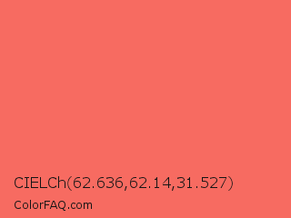 CIELCh 62.636,62.14,31.527 Color is a light red color and the nearest color is Pastel Red #ff6961. Hex code #f76b61 and RGB value is rgb(247,107,97). In RGB color space, this color is composed of 97% red, 42% green, 38% blue, In CMYK color space, this color is composed of 0% cyan, 57% magenta, 61% yellow , 3% black , In HSL color space, this color has a hue angle of 4° , 90% saturation and 67% lightness.