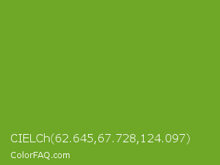 CIELCh 62.645,67.728,124.097 Color is a normal green color and the nearest color is Green RYB #66b032. Hex code #6fa727 and RGB value is rgb(111,167,39). In RGB color space, this color is composed of 44% red, 65% green, 15% blue, In CMYK color space, this color is composed of 34% cyan, 0% magenta, 77% yellow , 35% black , In HSL color space, this color has a hue angle of 86° , 62% saturation and 40% lightness.