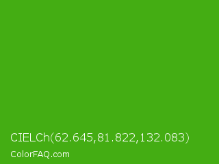 CIELCh 62.645,81.822,132.083 Color is a normal green color and the nearest color is Kelly Green #4cbb17. Hex code #44ad13 and RGB value is rgb(68,173,19). In RGB color space, this color is composed of 27% red, 68% green, 7% blue, In CMYK color space, this color is composed of 61% cyan, 0% magenta, 89% yellow , 32% black , In HSL color space, this color has a hue angle of 101° , 80% saturation and 38% lightness.