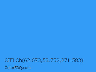 CIELCh 62.673,53.752,271.583 Color is a normal blue color and the nearest color is Brilliant Azure #3399ff. Hex code #339cf7 and RGB value is rgb(51,156,247). In RGB color space, this color is composed of 20% red, 61% green, 97% blue, In CMYK color space, this color is composed of 79% cyan, 37% magenta, 0% yellow , 3% black , In HSL color space, this color has a hue angle of 208° , 92% saturation and 58% lightness.