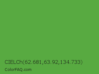 CIELCh 62.681,63.92,134.733 Color is a normal green color and the nearest color is Apple #4fa83d. Hex code #58aa41 and RGB value is rgb(88,170,65). In RGB color space, this color is composed of 35% red, 67% green, 25% blue, In CMYK color space, this color is composed of 48% cyan, 0% magenta, 62% yellow , 33% black , In HSL color space, this color has a hue angle of 107° , 45% saturation and 46% lightness.
