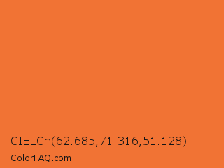 CIELCh 62.685,71.316,51.128 Color is a normal orange color and the nearest color is Vivid Tangelo #f07427. Hex code #f17334 and RGB value is rgb(241,115,52). In RGB color space, this color is composed of 95% red, 45% green, 20% blue, In CMYK color space, this color is composed of 0% cyan, 52% magenta, 78% yellow , 5% black , In HSL color space, this color has a hue angle of 20° , 87% saturation and 57% lightness.