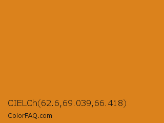 CIELCh 62.6,69.039,66.418 Color is a normal orange color and the nearest color is Zest #e5841b. Hex code #db821c and RGB value is rgb(219,130,28). In RGB color space, this color is composed of 86% red, 51% green, 11% blue, In CMYK color space, this color is composed of 0% cyan, 41% magenta, 87% yellow , 14% black , In HSL color space, this color has a hue angle of 32° , 77% saturation and 48% lightness.