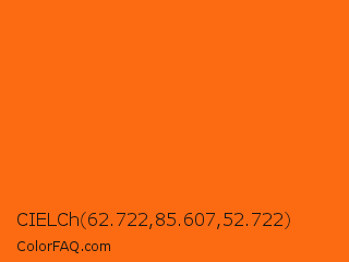 CIELCh 62.722,85.607,52.722 Color is a normal orange color and the nearest color is Pumpkin #ff7518. Hex code #fc6b12 and RGB value is rgb(252,107,18). In RGB color space, this color is composed of 99% red, 42% green, 7% blue, In CMYK color space, this color is composed of 0% cyan, 58% magenta, 93% yellow , 1% black , In HSL color space, this color has a hue angle of 23° , 98% saturation and 53% lightness.