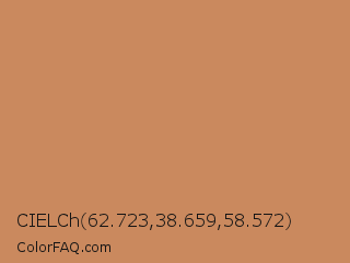 CIELCh 62.723,38.659,58.572 Color is a normal orange color and the nearest color is Antique Brass #c88a65. Hex code #ca895e and RGB value is rgb(202,137,94). In RGB color space, this color is composed of 79% red, 54% green, 37% blue, In CMYK color space, this color is composed of 0% cyan, 32% magenta, 53% yellow , 21% black , In HSL color space, this color has a hue angle of 24° , 50% saturation and 58% lightness.