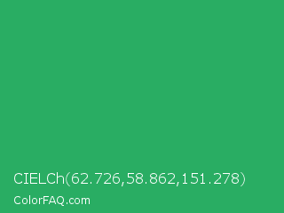 CIELCh 62.726,58.862,151.278 Color is a normal green color and the nearest color is Chateau Green #40a860. Hex code #29ad63 and RGB value is rgb(41,173,99). In RGB color space, this color is composed of 16% red, 68% green, 39% blue, In CMYK color space, this color is composed of 76% cyan, 0% magenta, 43% yellow , 32% black , In HSL color space, this color has a hue angle of 146° , 62% saturation and 42% lightness.
