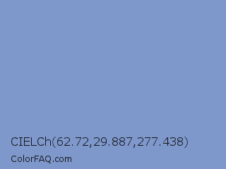 CIELCh 62.72,29.887,277.438 Color is a light blue color and the nearest color is Dark Pastel Blue #779ecb. Hex code #7e98cc and RGB value is rgb(126,152,204). In RGB color space, this color is composed of 49% red, 60% green, 80% blue, In CMYK color space, this color is composed of 38% cyan, 25% magenta, 0% yellow , 20% black , In HSL color space, this color has a hue angle of 220° , 43% saturation and 65% lightness.
