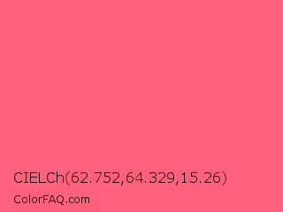 CIELCh 62.752,64.329,15.26 Color is a light red color and the nearest color is Brink Pink #fb607f. Hex code #ff617d and RGB value is rgb(255,97,125). In RGB color space, this color is composed of 100% red, 38% green, 49% blue, In CMYK color space, this color is composed of 0% cyan, 62% magenta, 51% yellow , 0% black , In HSL color space, this color has a hue angle of 349° , 100% saturation and 69% lightness.