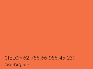 CIELCh 62.756,66.956,45.23 Color is a light color and the nearest color is Mandarin #f37a48. Hex code #f37145 and RGB value is rgb(243,113,69). In RGB color space, this color is composed of 95% red, 44% green, 27% blue, In CMYK color space, this color is composed of 0% cyan, 53% magenta, 72% yellow , 5% black , In HSL color space, this color has a hue angle of 15° , 88% saturation and 61% lightness.
